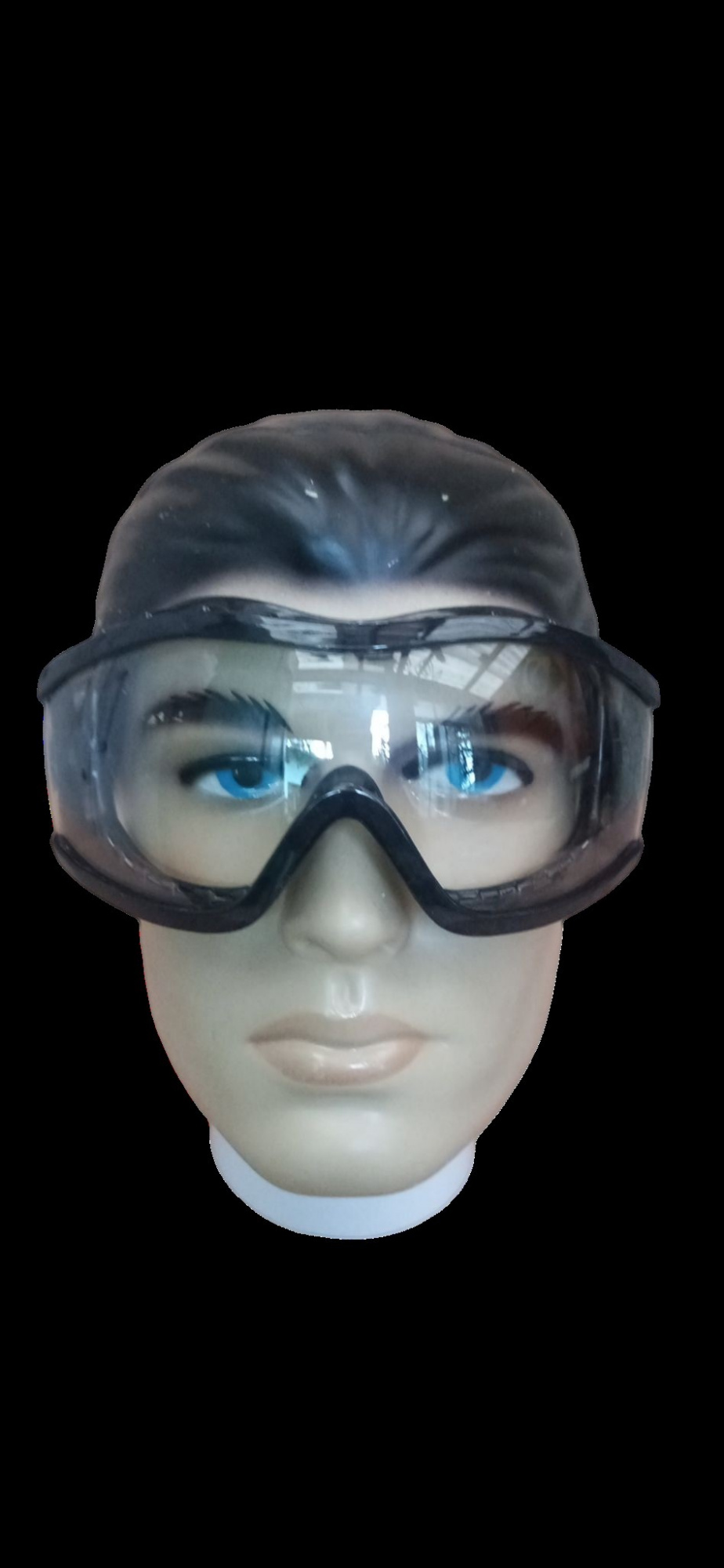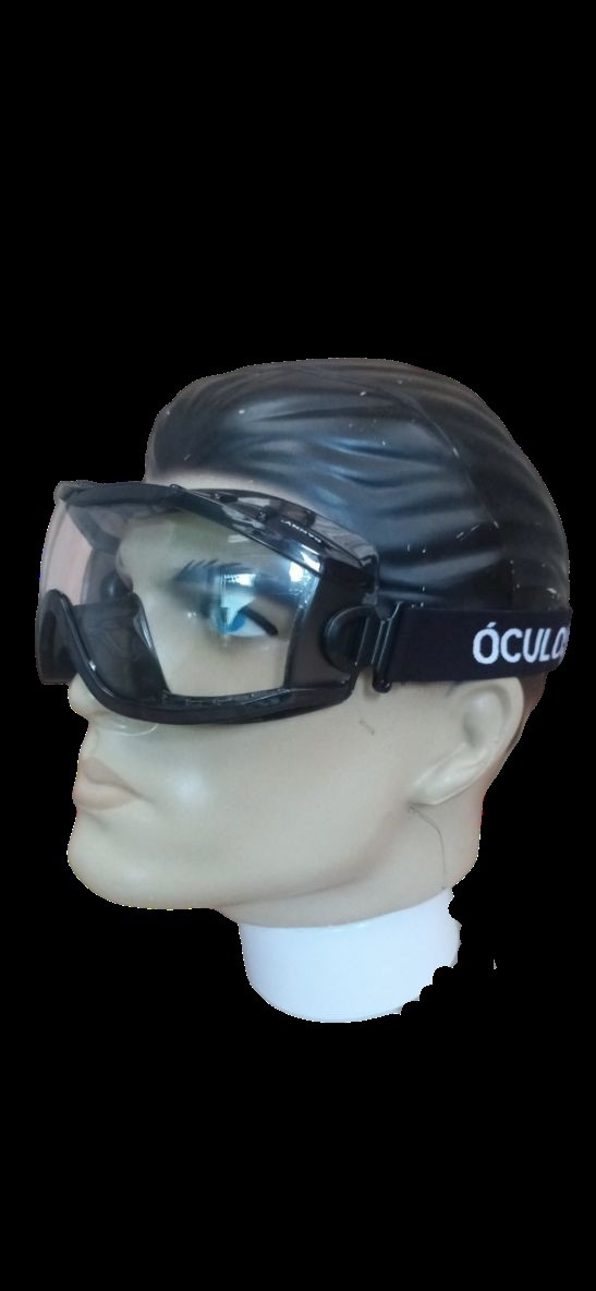 Óculos de segurança ampla visão, com lente de proteção em policarbonato, com tratamento antirrisco, antiembaçante e UVA e UVB, ventilação indireta, armação em PVC flexível e elástico ajustável.