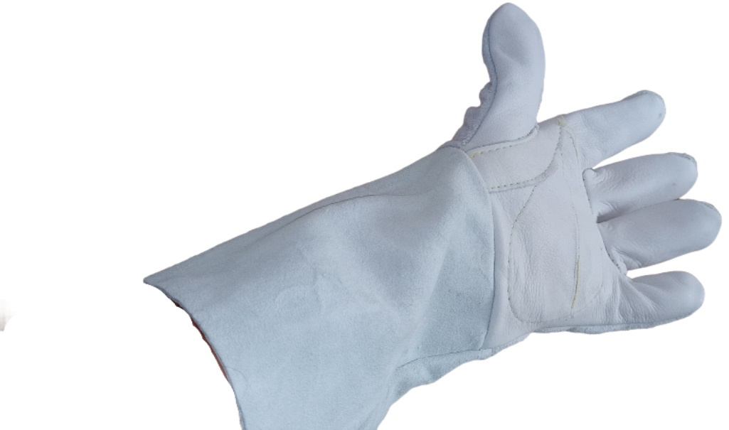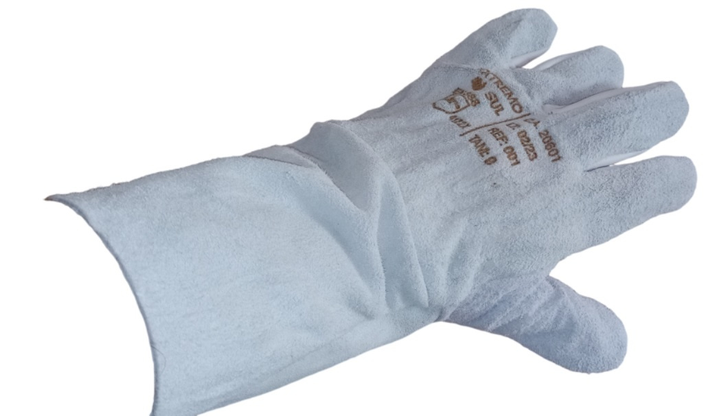 Luva para segurança com cinco dedos, confeccionada em vaqueta natural na palma e raspa no punho e costas, com reforço palmar interno em raspa e elástico embutido no dorso, costurada com linha de kevlar® o que garante maior durabilidade para trabalhos com solda, garantindo que a costura não abra com o calor