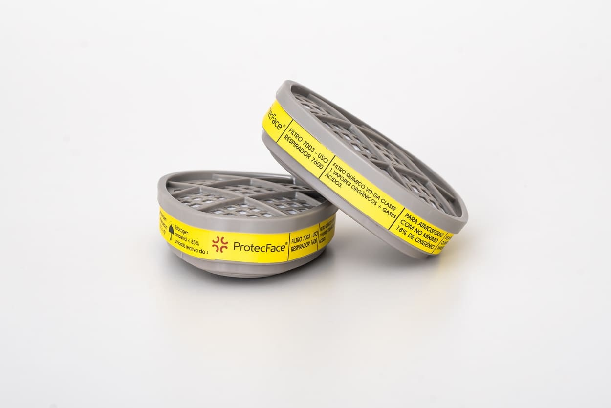 Cartucho Químico ProtecFace 7003, indicado para filtragem de vapores orgânicos e gases ácidos, proteção contra gás cloro, cloreto de hidrogênio, dióxido de enxofre, fluoreto de hidrogênio.