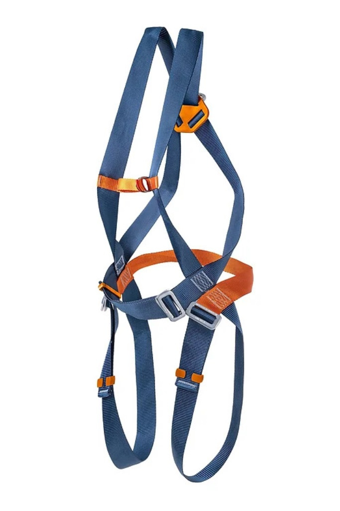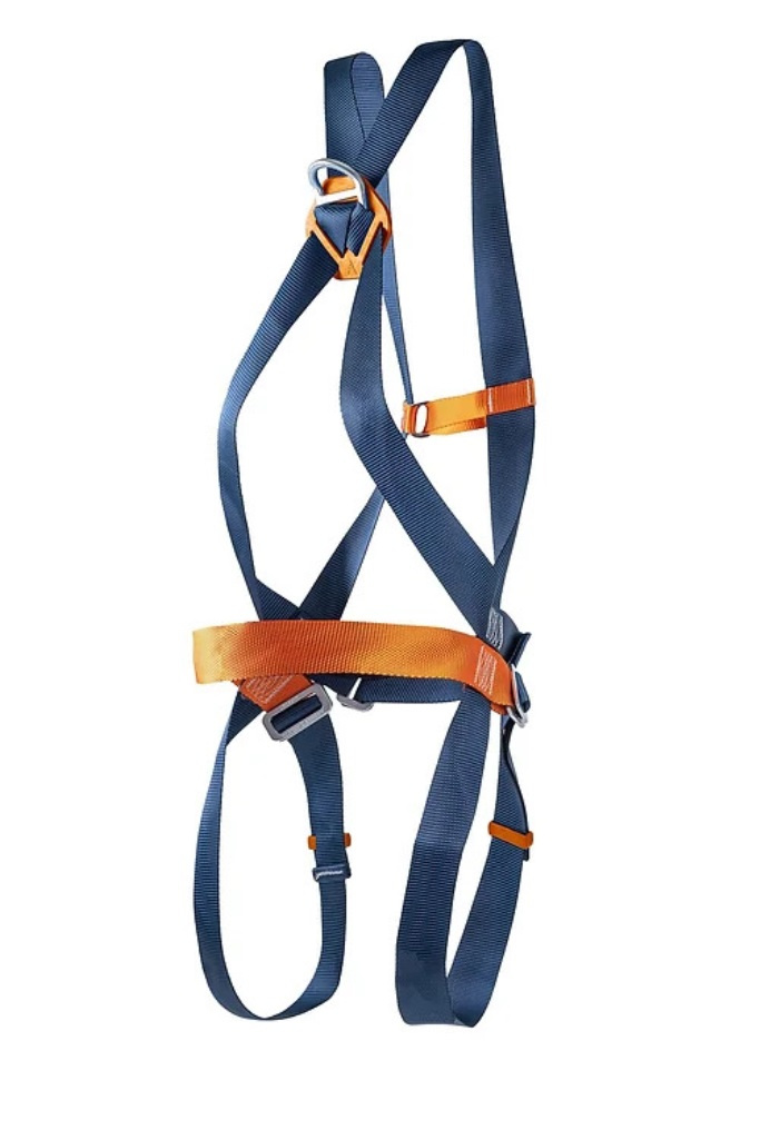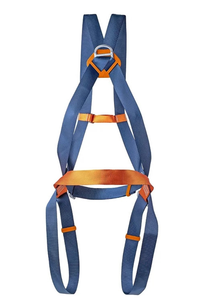Cinturão de segurança tipo paraquedista confeccionado em poliéster com 01 ponto de conexão dorsal por meio de uma meia argola em aço para retenção de queda.