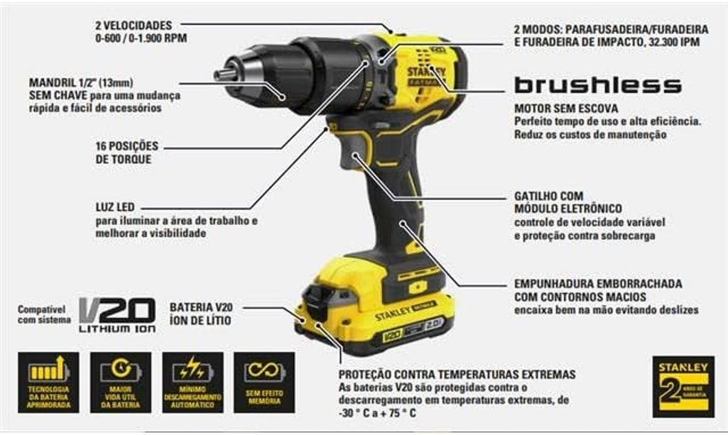 A Parafusadeira/Furadeira de Impacto faz parte do sistema V20, que permite usar a mesma bateria com toda as novas ferramentas do sistema V20. Oferece um excelente desempenho que os profissionais mais exigentes precisam em suas aplicações. Motor Brushless sem escova de carvão oferece vantagens significativas quando comparados com modelos com escovas. Mais potência os motores Brushless não perdem energia no atrito ou calor, fornecendo mais performance, maior duração e um consumo menor de energia. Compacta e leve seu tamanho e consideravelmente reduzido graças a essa tecnologia.